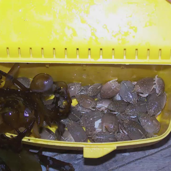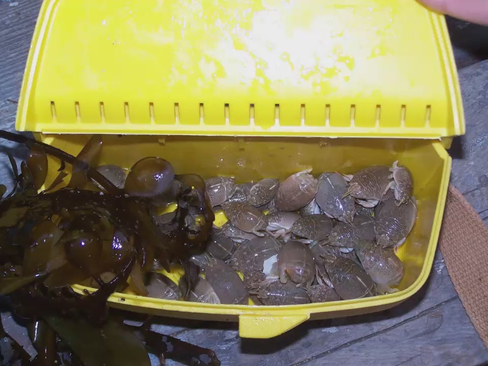2. Keep crabs in a plastic container with a moist piece of kelp over them. They need to keep cool and wet.
